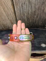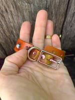 This little charmer is made from vegetable tanned and dyed leather. Turquoise and silver colored rivets adorn every other stamped daisy flower. pictured in a rust saddle tone but available in warm medium brown several colors can be made upon request. (see separate listing for custom name plate. )